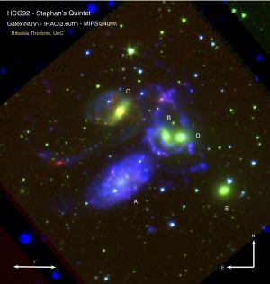 Στα δεξιά μπορεί κανείς να δεί ένα παράδειγμα συνδιαστικής εικόνας (RGB-image) απο δύο διαστημικά τηλεσκόπεια. Το μπλε χρώμα αναφερεταί στο υπεριώδες, απο το διαστημικό τηλεσκόπειο UV-Galex, το πράσινο είναι το κοντινό υπέρυθρο, και το κόκκινο το μέσο υπέρυθρο απο τα δύο όργανα (IRAC, MIPS) του διαστημικού τηλεσκοπείου Spitzer (Διαστημικό Τηλεσκόπιο Spitzer)